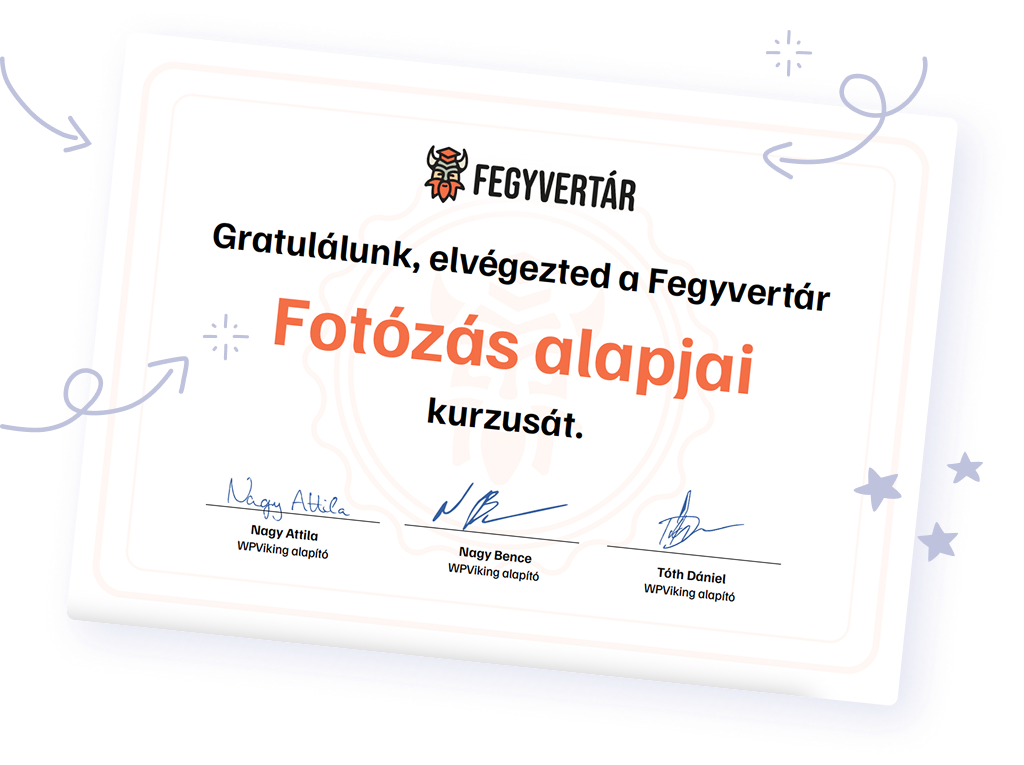 A tanfolyam végén nemcsak lezárjuk az együtt töltött tanulási utat, hanem meg is ünnepeljük a fejlődésedet. A záró kvíz segít átlátni, mennyit léptél előre, és mennyire vált a fotózás tudatos, magabiztos része az életednek. A sikeres teljesítés után “képernyőhöz” kapod az okleveled: ez nem egy egyszerű papírt, hanem egy kézzelfogható elismerést, ami bizonyítja, hogy a gombnyomkodásból valódi képalkotói látásmódra váltottál. Ez az oklevél emlékeztetni fog arra, hogy képes vagy bármilyen fotós célt megvalósítani, és inspirál majd, hogy tovább feszegesd a kreativitásod határait.