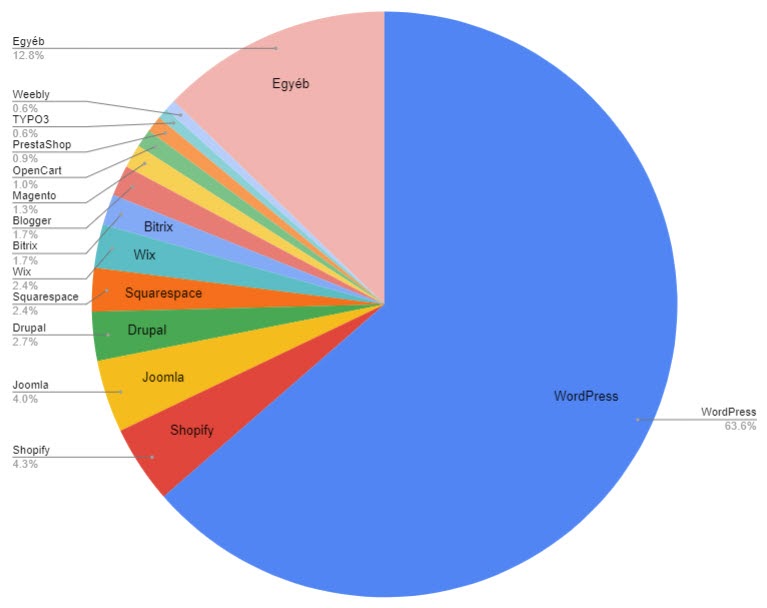 Persze ez nem meríti ki a lehetőségek tárházát, más CMS-ek is léteznek, de a WordPress dominanciáját az alábbi ábra is megmutatja:*