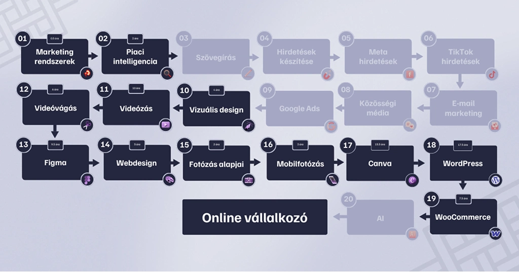 Nem. Sőt, ezt a kurzust javasoljuk első lépésnek, amikor valaki nálunk kezd tanulni. Rálátást ad a vállalkozások logikájára, a fő üzleti modellekre és az „ellenállhatatlan” ajánlat felépítésére — ha ezeket érted, sokkal stabilabb alapokra tudsz építeni, és rengeteg irányban elindulhatsz.