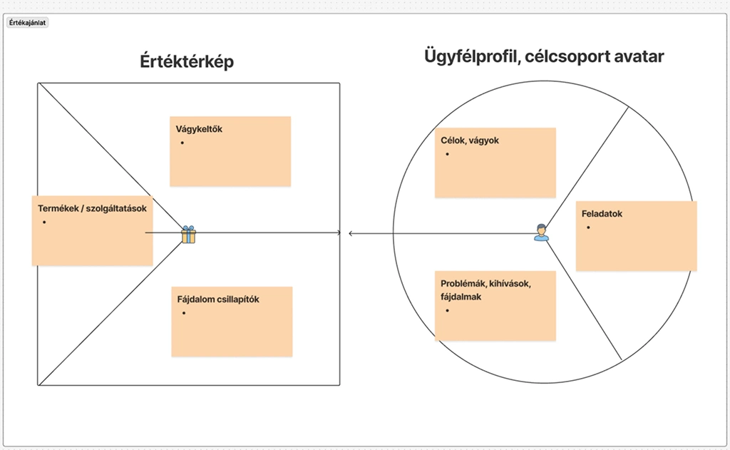 Külön bontja az ügyfélprofilt és az értéktérképet, hogy kristálytisztán lásd: mivel oldod meg a vevő problémáját és mitől lesz vonzó az ajánlatod.