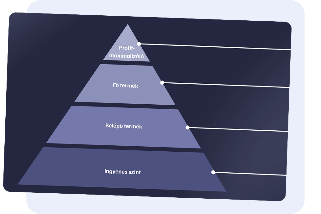 Nem egy eladásban gondolkodunk, hanem teljes ügyfél-életútban, hogy tervezhető bevétel és nagyobb mozgástér legyen. A kínálatot termékpiramisba rendezzük (ingyenes → belépő → fő termék → profitmaximalizáló), és upsellekkel okosan emeljük a kosárértéket.