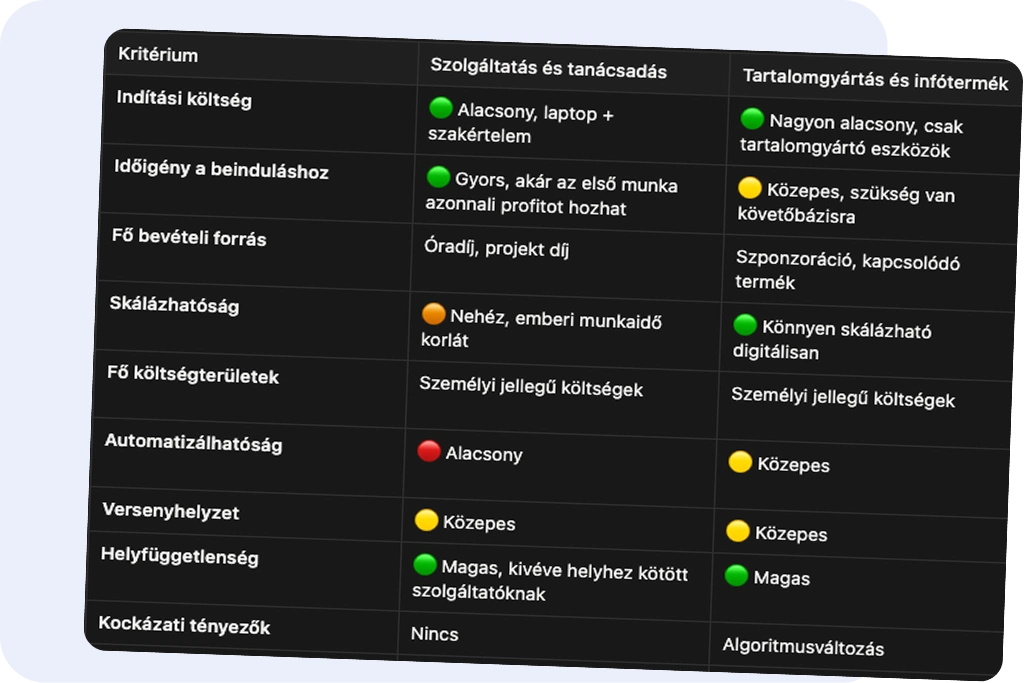 Átlátod a fő vállalkozástípusokat, az előny–hátrányokat és a keverési lehetőségeket, majd az Üzleti Modell Vászon mentén tisztán kirajzolod: mit adsz el, kinek, hol, hogyan és miből lesz pénz. Így nem érzésből, hanem keretrendszerrel döntesz az indulásról.
