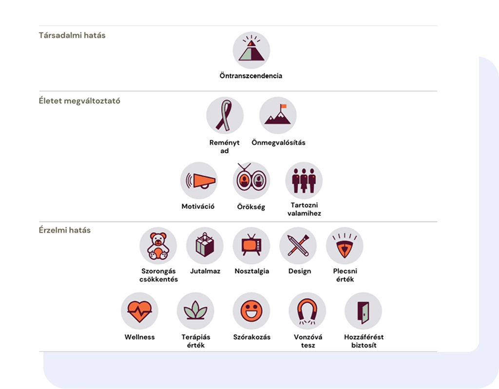 Képes leszel pontosan meghatározni, miben különbözöl másoktól, és hogyan kommunikáld ezt úgy, hogy a piac rögtön értse az előnyeidet. Az értékpiramis segítségével tudatosan megmutatod a projekted erősségeit, és pontos képet kapsz arról, hová érdemes pozicionálnod magad, hogy kitűnj a tömegből.