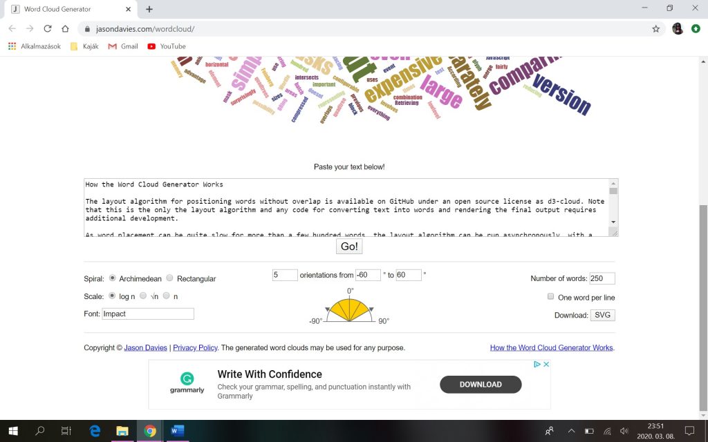 A Jason Davies’ szófelhőgenerátor azoknak való, akik nem éppen kezdőnek számítanak. Némileg bonyolultabb, igényel tudatosságot a kezelése, de ezzel is remek kreációk készülhetnek. Ha azonban most először próbálkozol ilyesmivel, inkább egy egyszerűbbet javasolunk, például amiket az előzőekben mutattunk be.