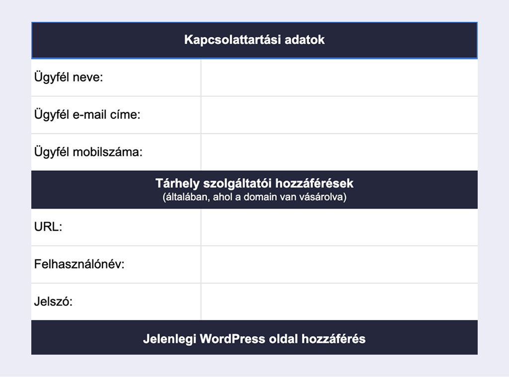 Egy előre elkészített, szerkeszthető dokumentum, amiben rendszerezetten tárolhatod a hozzáféréseidet, jelszavaidat, és ügyféladatokat